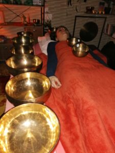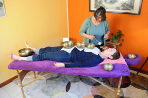Pour la pratique d’un « massage sonore », je positionne les bols sur la personne (habillé). Ces séances se déroulent en individuel ou en couple.